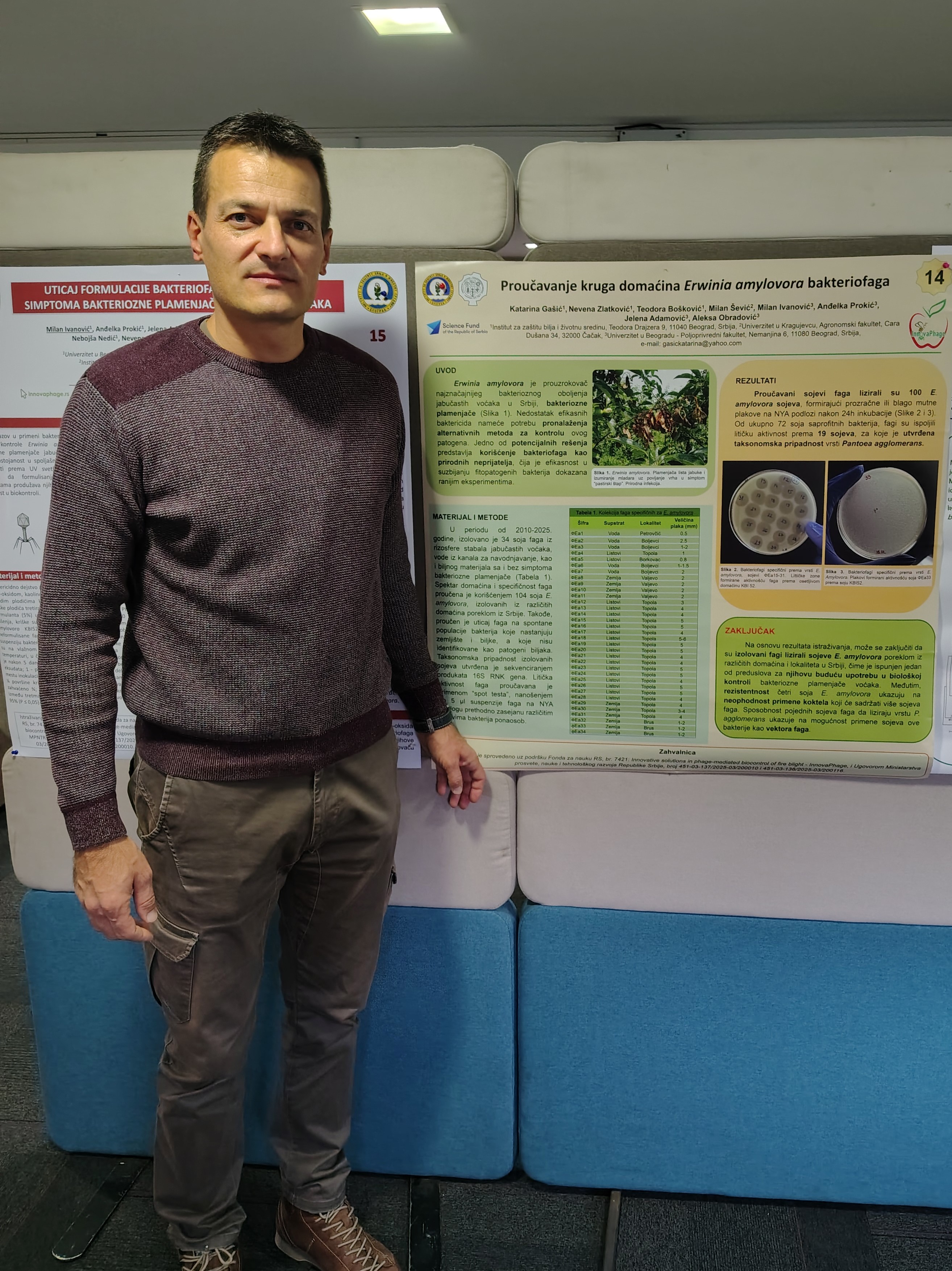 U sklopu realizacije InnovaPhage projekta koji ima za cilj unapređenje suzbijanja bakteriozne plamenjače primenom bioloških agenasa – bakteriofaga, prikupljani su uzorci biljaka domaćina iz različitih lokaliteta u Srbiji gde je uočena pojava bolesti. Utvrđeno da je Erwinia amylovora prouzrokovač oboljenja na nekoliko lokaliteta. Istovremeno, izvršena je izolacija bakteriofaga i proučena njihova specifičnost prema sojevima bakterije E. amylovora.